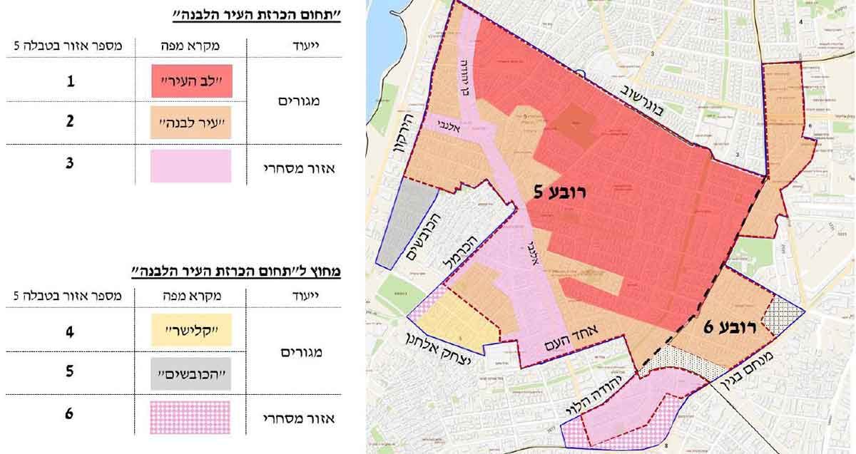 - בתוך לב העיר הלבנה (מדרום לרחוב בוגרשוב): הבינוי המרבי יעמוד על 6 קומות, עם מקדם יח”ד של 80. זהו אזור רגיש במיוחד, שבו עקרונות השימור קודמים לכל.