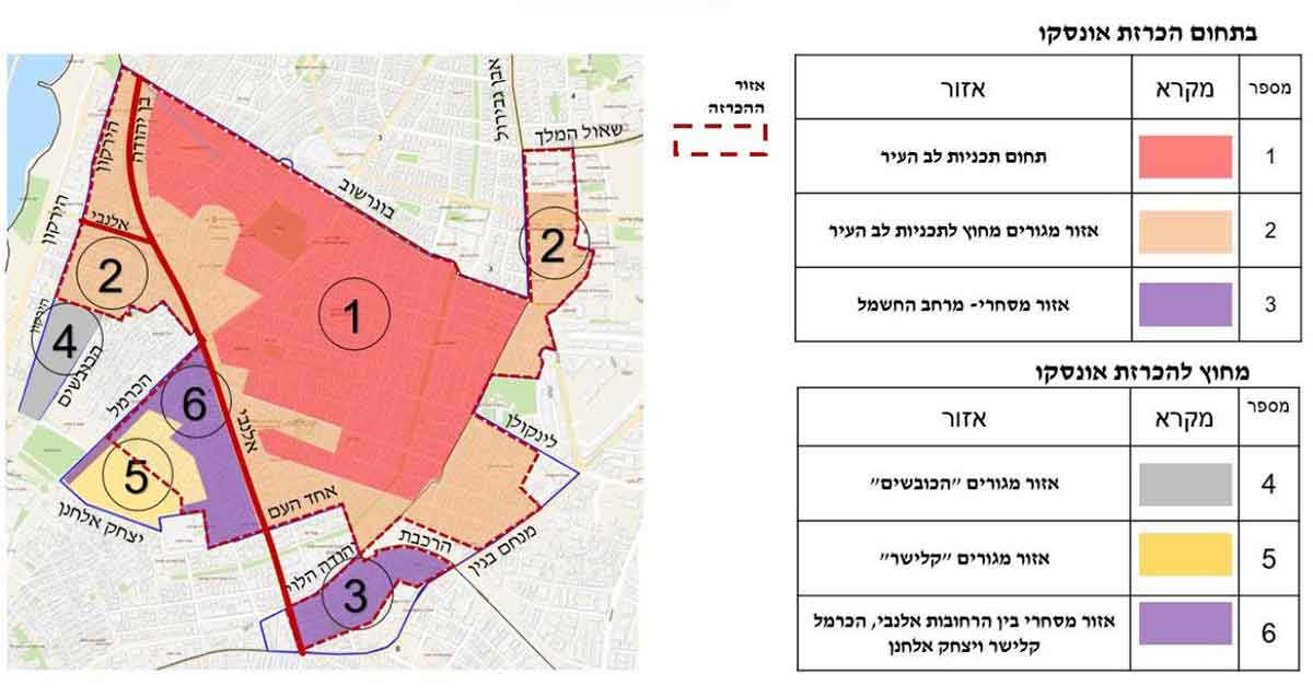 - לאורך רחובות מסחריים ראשיים כמו אלנבי, בן יהודה, קרליבך, הרכבת, מנחם בגין, הכרמל ויהודה הלוי – גובה הבנייה המרבי נשמר ב-6 קומות, אך מקדם היח”ד נמוך יותר (65), מה שמאפשר תוספת משמעותית של יחידות דיור בזכות התכנון הכלכלי של השטח.